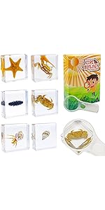 This Insect Specimen Set features six different insect species perfectly preserved in clear Lucite resin blocks, accompanied by a magnifier and an educational booklet. Ideal for children aged 3+, it offers a hands-on scientific experience that fosters exploration and learning about the natural world. Durable and visually striking, it also serves as a unique gift or decorative paperweight, backed by reliable customer support.