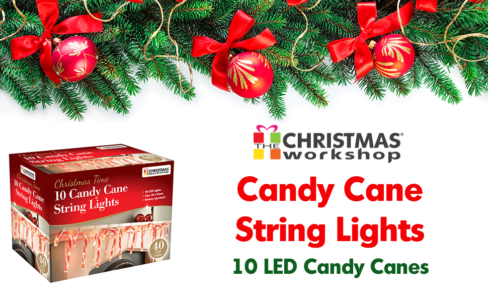 The Christmas Workshop 70039 string lights feature 10 red and white candy cane-shaped LED lights on a 1.8m battery-operated string. Designed for indoor use, these energy-efficient (A+++) lights provide a festive, cordless glow perfect for mantels, mirrors, or cozy corners. Each candy cane contains 4 micro LEDs, delivering bright, long-lasting illumination powered by 2 AA batteries (not included).