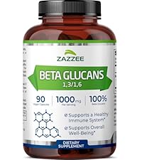 Zazzee Extra Strength Beta Glucans offers a potent 1000 mg dose of 100% pure Beta Glucans, combining both 1,3 and 1,6 types in a vegan, non-GMO formula. Packaged in a 90-capsule bottle, it supports a healthy immune system with premium quality assurance from a certified US facility.