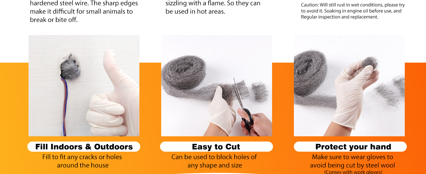 I used these to seal gaps around pipes by the flooboards, to stop mice getting in. Easy to use. Gloves are provided. A little steel wool goes a long way - I bought two packs when one was more than enough. I had to hoover up afterward as the bags drop some dust.