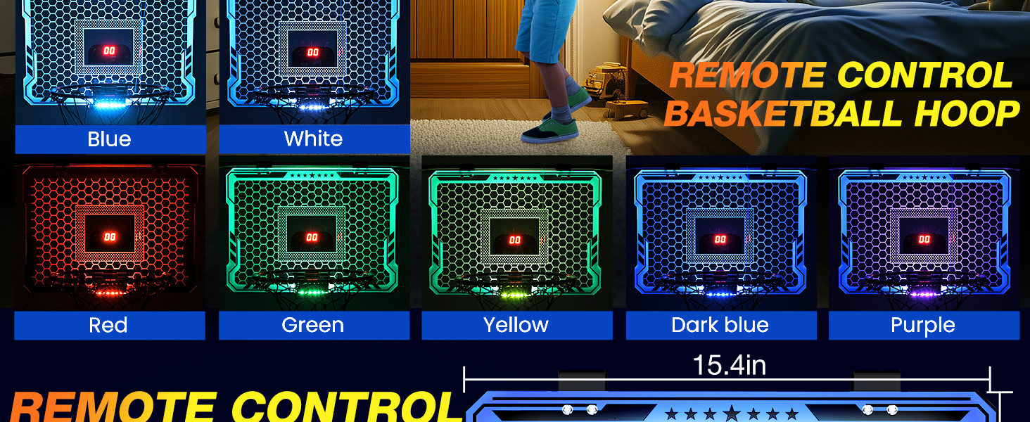 The ropoda Indoor Basketball Hoop is a compact, door-mounted mini hoop featuring a remote-controlled electronic scoreboard with 7 LED light colors and 3 game modes. Designed for kids and adults, it includes 4 high-quality rubber balls and a shatterproof backboard with protective foam for safe, quiet play. Its foldable design allows easy installation and storage, making it an ideal interactive toy and gift that enhances hand-eye coordination and family bonding.