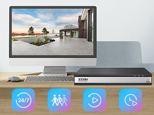 The ZOSI 1080p 16 Channel Security Camera System features AI-driven human and vehicle detection to minimize false alerts, an extendable 16-channel hybrid DVR with 8 weatherproof 1080p bullet cameras offering 120ft night vision and a 105° wide angle. It supports local and remote access via free apps, uses advanced H.265+ compression to save storage by 80%, and allows customizable recording modes per camera for optimized security management.