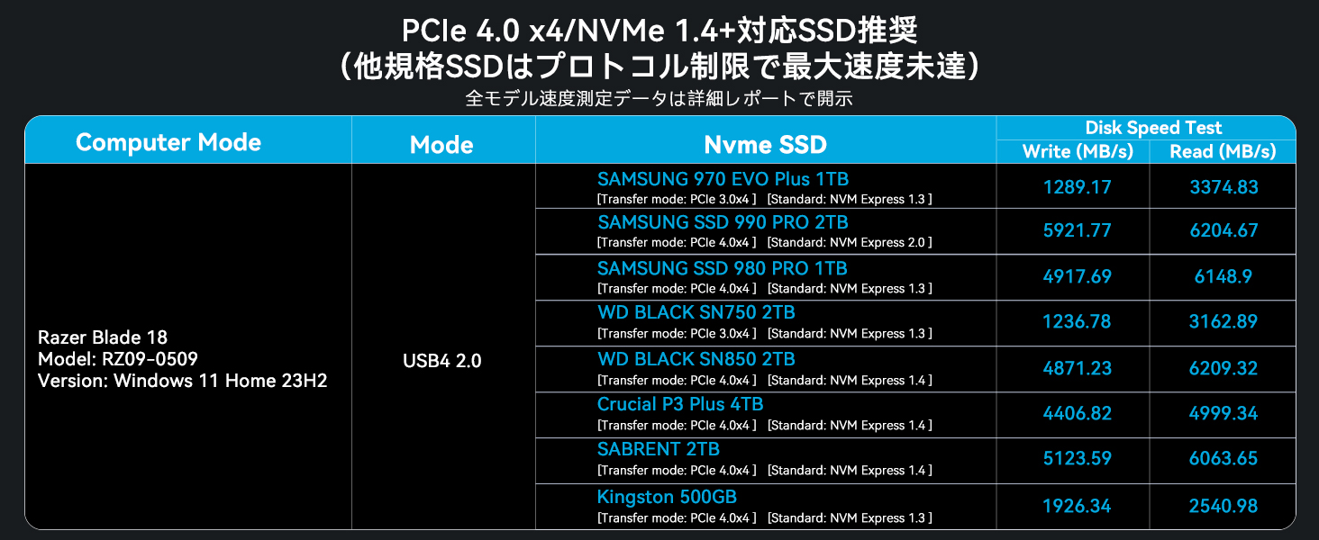 IntelのThunderbolt 5コントローラー「JHL9480」を搭載しています。重さはSSDなしで144g。PCIe 4.0x4接続なので、実際には64Gbpsが転送速度の上限となります。JHL9480単体ではUSBはオプションですが、Realtek RTL9210コントローラーも併載しているので、USB3 10Gbpsにフォールバック可能です。アルミケースの見た目が良く、ネジやマグネットではなく、ボールキャッチでパチンと蓋を開閉できます。SSDの固定はゴムクリップ。サーマルパッドは0.5mmと1.0mmが1枚ずつ付属しますが、蓋の窪みが1.0mm、SSDのヒートスプレッダの厚みによっては周囲より1.0mm低いので、市販のパッドを追加して1.0+1.0mmか、0.5+1.5mmの貼り合わせも検討したほうがよいです。薄型のファンが内蔵されていますが、サーマルスロットリングが掛かるような温度にならないと自動では廻りません。サーマルパッドが適切に装着されていれば通常は放熱されますが、温度が高い場合はコネクタ横のボタンを長押しして強制的に作動できます。付属のケーブルには「5」のシルク印刷がありますが、eMarkerは40Gbpsを示し、ASUS ThunderboltEX 5(JHL9580)に繋ぐと40Gbpsしか出ませんでした。Cable MattersのTB5認定ケーブルを使うと80Gbps出ます。蛇足ですが、本機の型番はTB501Proです。(ページの型番はTBU405Pro Maxになっていますが、これはデュアル40Gbの別の商品です)